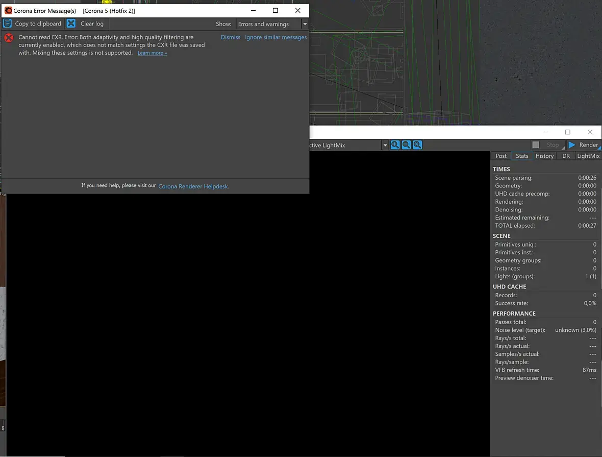 Вчера сохранил Corona EXR, сегодня пытаюсь возобновить с него рендер, а он выдаёт ошибку. В сцене и настройках ничего не менялось. Если выключаю Adaptivity Light Solver, то выдаётся та же ошибка. Если выключаю High Quality Filterring, выдаёт ошибку, что не хватает рендер элементов.