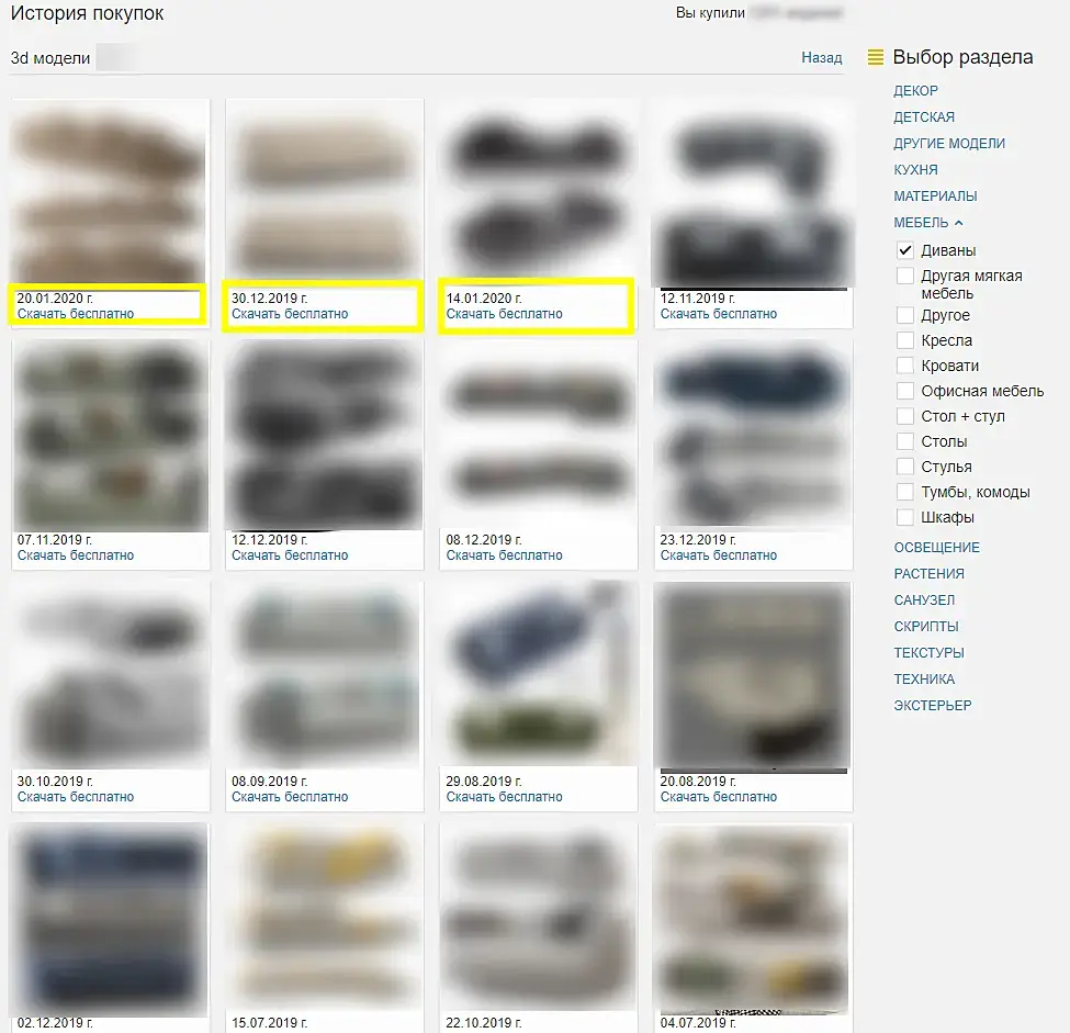 В разделе купленных моделей они расположены не по дате покупки а как то рандомно, причем на следующей странице могут появиться модели уже показанные на первой странице!