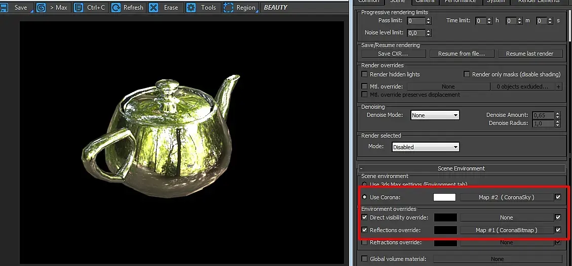 Я делаю так: создаю солнышко, соглашаюсь с созданием неба для него. Потом Это небо из енвиронмента перетягиваю инстансом в свиток GI в environment настроек рендера, а взамен него - пихаю хдрку красивую. В итоге хдркку видно и за окном, и в отражениях, и в преломлениях, а освещается всё чётенько и бесшумно скаем. Dome light не юзаю вопще - мне он неудобен жутко.