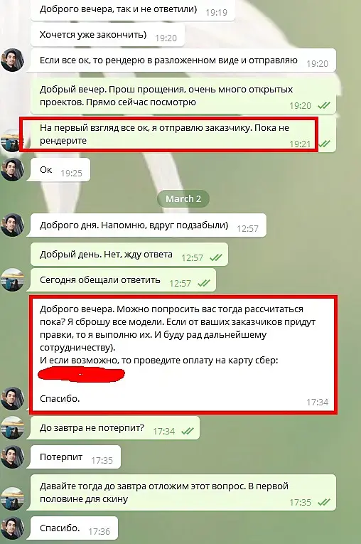 Здесь так же видно, что я не стал ждать до завтра, пока вы доделаете работу, и оплатил ЗАРАНЕЕ все, что вы просили оплатить.