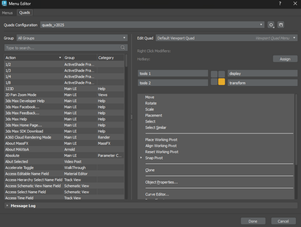 Уважаемые гуру 3Dsmax. такой вопрос у меня возник, давно пользуюсь панелью Quads для быстрого поиска функций программы и хотел бы добавить туда определенный блок, который можно найти в верхнем левом углу программы 3dsmax (окно viewport - Main Toolbar и в нём Selection Filter) на скрине показал. Так как я пользуюсь Forest Pack и Rail Clone плагинами, не хотелось бы постоянно вести мышку в эту область и спокойно залезать через меню Quads и находить эту функцию. Вопрос именно в том, как найти эту вкладку Selection Filter в настройках Quads? Потому что там я её не нахожу, может кто уже сталкивался с такой темой?