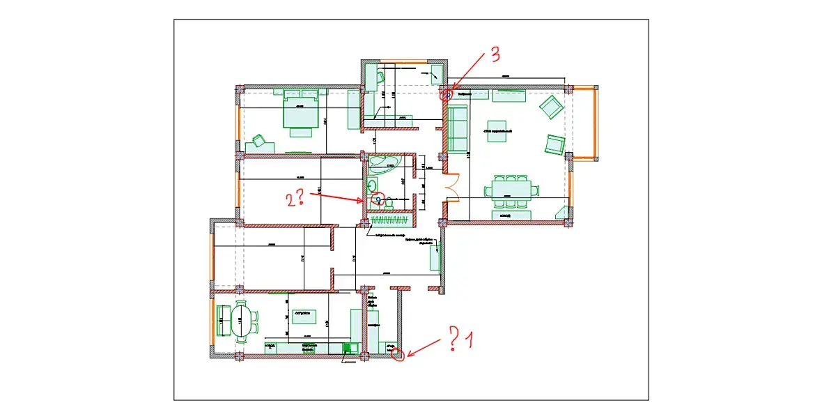 да с лишним поворот я конечно пересмотрю вариант если вы имеете ввиду цифру два где указали , а где цифра 1 я укажу , я варианты еще не завершила думала здесь не возникнет вопросов но не тут то было) конечно закончу и в красивом формате покажу заказчикам) а на счет планировки пока не получилось кухню и зал вместе расположить в верхней части ) но еще подумаю по этому поводу