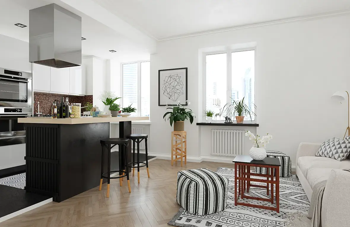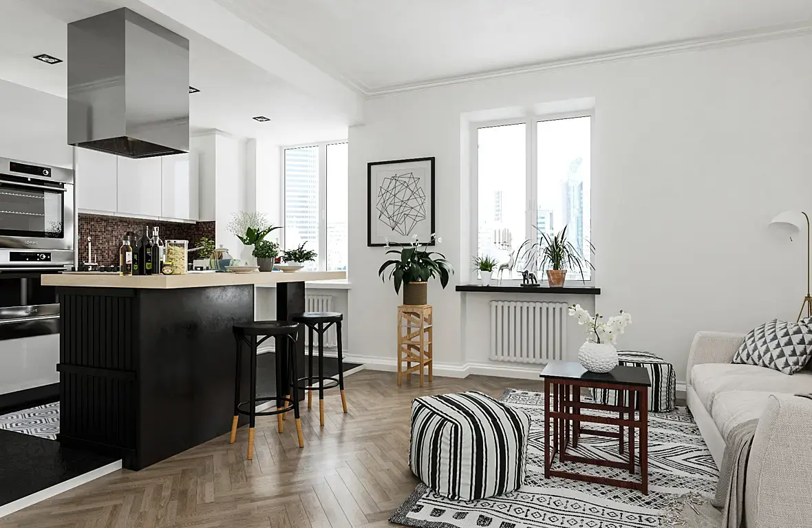Маппинг на журнальном столике и этажерке под цветок неправильный. Стены и потолок должны быть разными по цвету, хоть немного. Металл выглядит не особо металлическим. Бутылки на столешнице как будето из фотошопа, мутные какие-то. Зелень плохо смотрится и не очень подходит по цветовому балансу к сцене. Лесенка на окнах вокруг фона. Фаски на стенах надо снимать. Плинтус на кухонной зоне "врос" в пол. Для начала хватит.