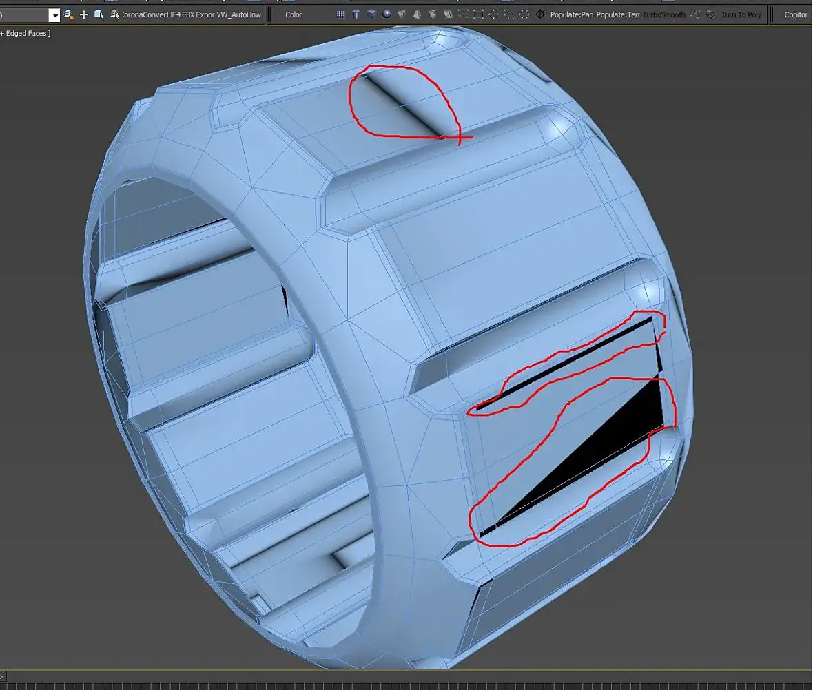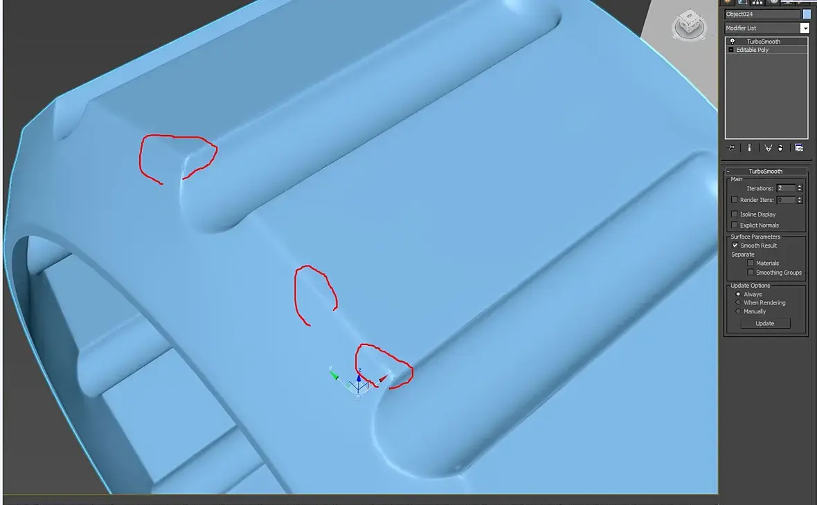 Подскажите пожалуйста. Завис с этой проблемой и не знаю как решить. В какой-то момент турбосмус глюканул и начал выдавать такое как на первой картинке - какие то траблы на сглаженой модели. Вертексы все сшиты, нормали наружу - не пойму в чем дело. И на несглаженной модели появились черные полосы и треугольники. !!! Help !!