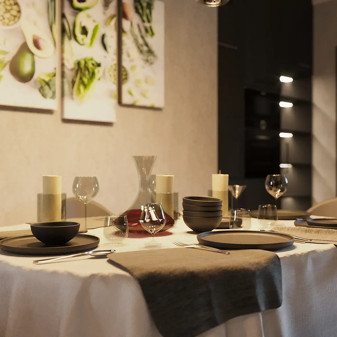 Nastik, если какие-то объекты будут немножко заходить друг в друга - это ничего страшного, лучше чем он будет висеть над ним. Я бы ещё с композицией по сидел, в этом кадре (кусок лампы сверху, скатерть обрезана снизу, кусок тарелки обрезан слева и т.д.) Там если обрезать часть объекта - то резать капитально 1/3 минимум, если нет - то стараться оставить его целым. По возможности может добавить Депс и глубину немного сделать, не только фокусом камеры. Если прям хотите художественное что-то.