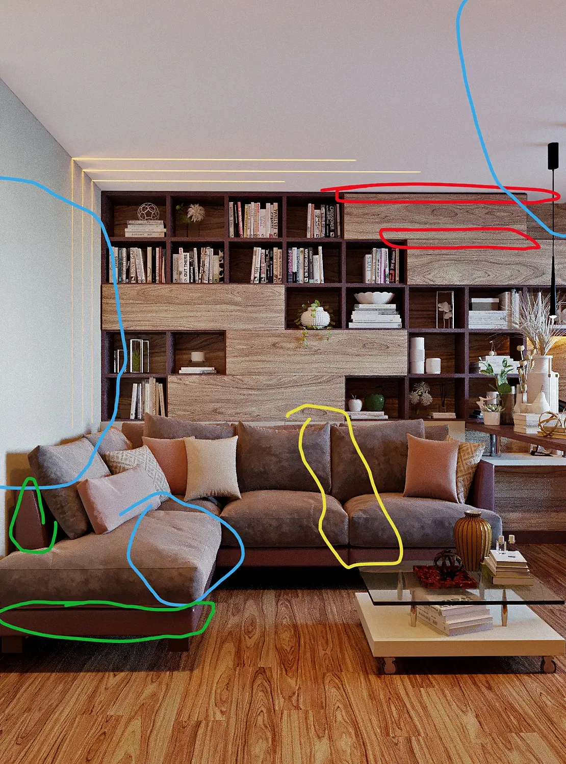 Желтым - неравномерность дивана. Он у Вас плоский довольно таки. И нету той игры света/тени