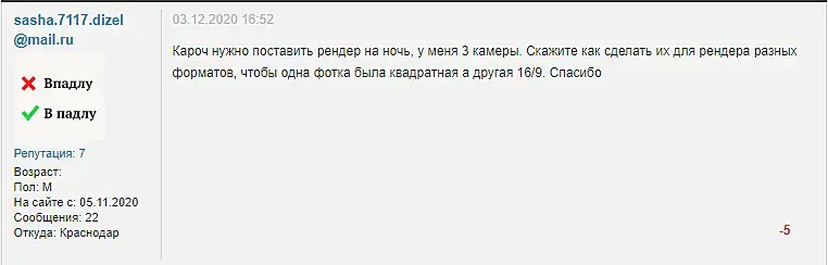Кароч нужно поставить рендер на ночь, у меня 3 камеры. Скажите как сделать их для рендера разных форматов, чтобы одна фотка была квадратная а другая 16/9. Спасибо