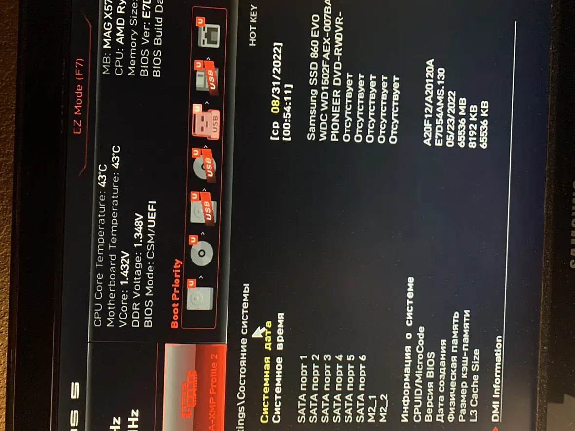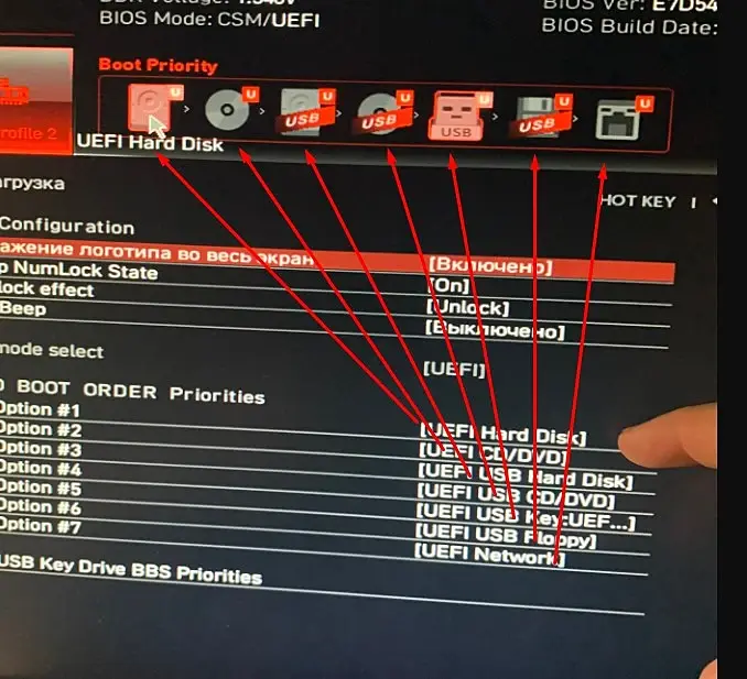 Я первым делом обратил внимание на странное название биоса. E7D54AMS, это че вообще )) Там вроде последняя версия это 7D54v13 или 7D54v141 бета. А вообще да. Правильно подсказывают что надо смотреть Boot Priority. Что бы указать откуда винду загружать. Просто выставить что бы SSD был №1 на загрузку.