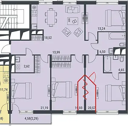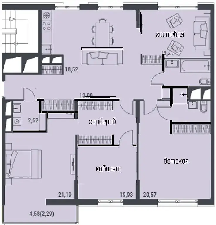 Нужны 3 спальни (родительская, детская и гостевая) плюс рабочий кабинет (комната площадью 13,2).