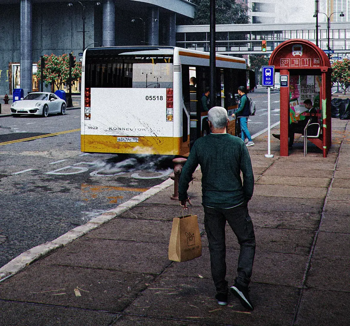 Я особо ничего интересного не увидел. Ну может только номер автобуса из рф, и машина сдающая назад на хайрезе