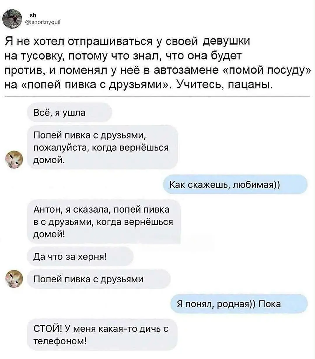 так там надо пол-телефона менять тогда, а не только помой посуду. - "помой полы, пропылесось, надо починить, протри пыль, постирай, поедем к маме на дачу" и плюсом, "у меня что-то с телефоном" на "ну отлично, всё норм, рада за тебя" и тд.