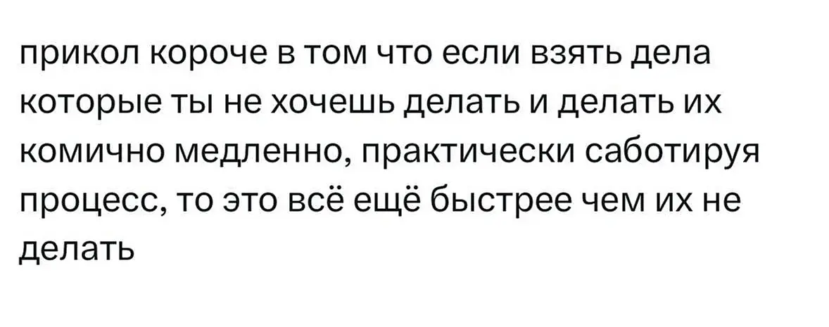 А я наоборот стараюсь сделать нелюбимые дела как можно быстрее, чтобы не висел этот домоклов меч и постоянно не вспоминать о них и не расстраиваться.
