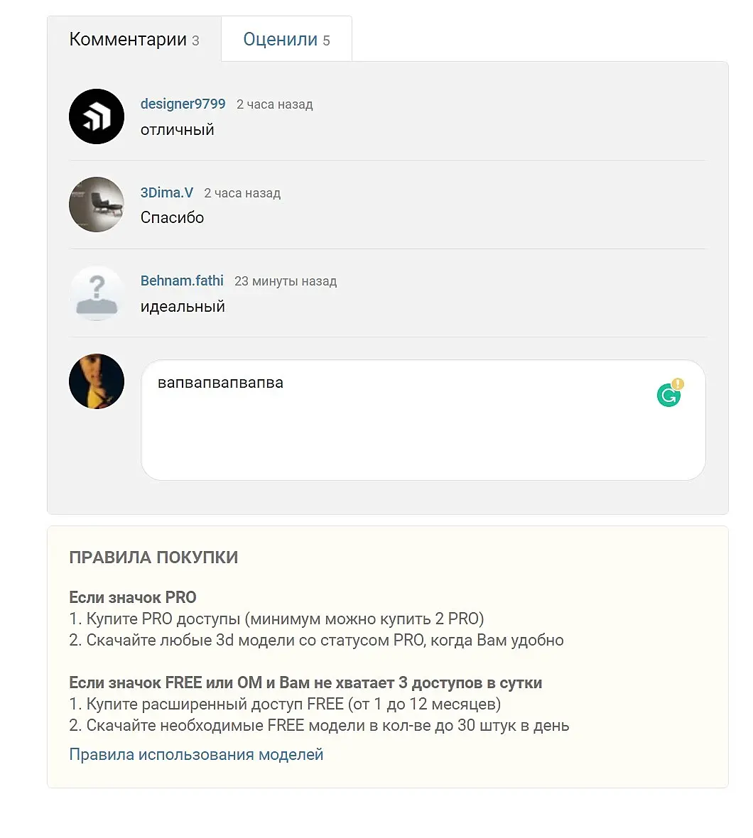 почему-то не могу оставлять коменты к моделям, хотя в галерее нет такой проблемы. В моделях же просто поле для ввода текста, но кнопки чтоб его отправить нет. Это как так? Или если нет активного статуса pro, то и слова молвить не могу? :) Даже ответить на комментарии к своим моделькам не могу