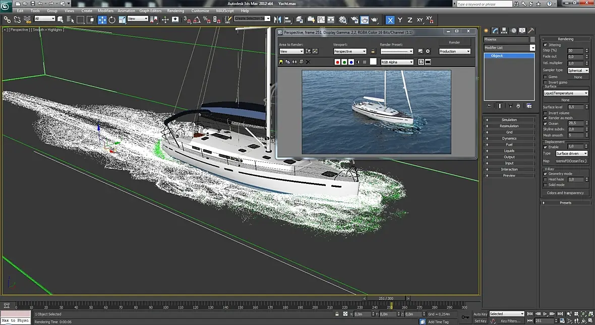 На рендере у вас вроде есть частицы, только очень мелкие. В районе носа яхты?
