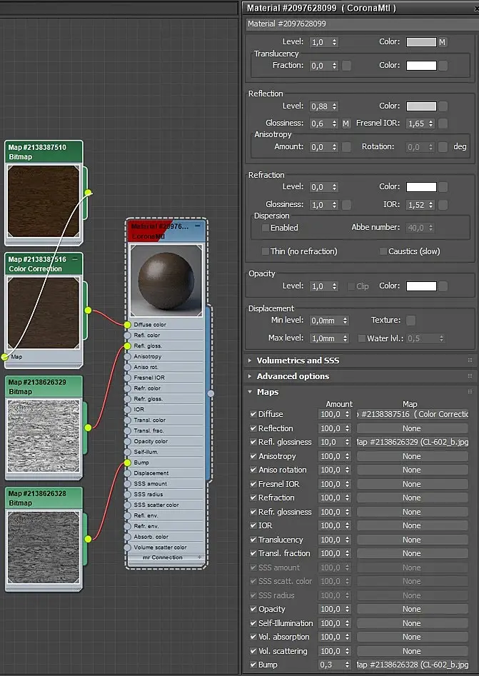 Level на рефлекте вернуть дефолт 1 (для не-металлов это рекомендовано), IOR вернуть деф 1,52, поменять карту в рефлект глоссинес на гораздо более темную (взять из диффуза и через corona color correct настроить), можно ее же в слот анизотропии, чтобы блик стал еще интереснее