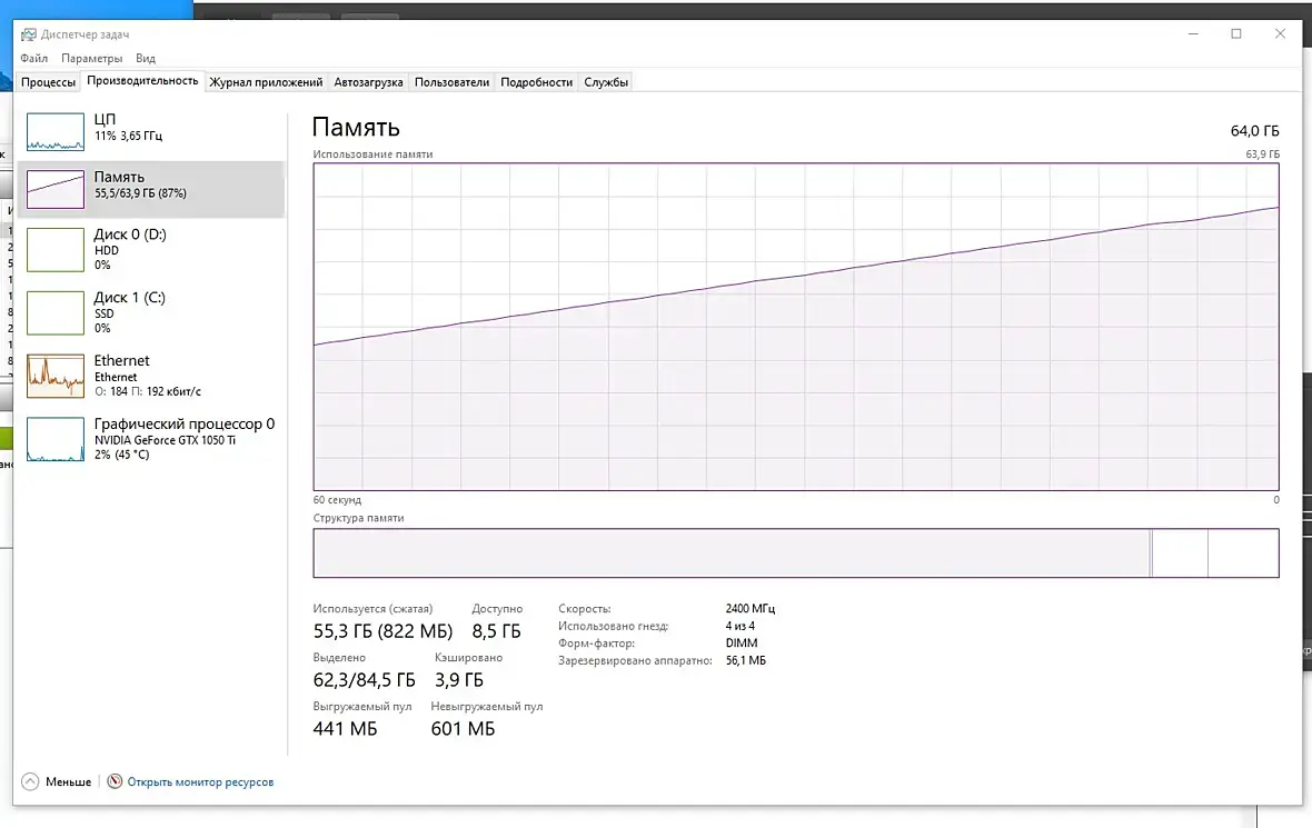 Сегодня столкнулся с такой проблемой: запускаю пеакетный рендер небольшой интерьерной сцены, рендер запускается и какое-то время процесс идёт нормально, но потом (где-то минут через 40 после начала рендера) чем-то полностью забивается оперативная память (в начале рендера используется 14 гб из 64) и макс начинает постоянно обращаться к жёсткому диску, из-за чего загрузка процессора со 100% падает до 8-10%, соответственно в 10 раз увеличивается время окончания рендера, а ещё через какое-то время работы в таком режиме макс полностью вылетает.