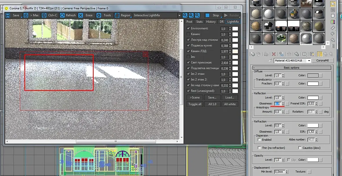 Добрый день. Не могу понять в чём проблема и как её решить. Сцена освещена HDRI на полу материал с отражением когда свет от солнца падает на пол и стаит отражение больше 0,2 идут разрывы на полу. Чем больше значение отражания тем сильнее разрываются лучи от солнца. Прилагаю скрины на них всё видно. Корона 1,7 fix 2. Я так понимаю что это связанно с изменениями параметра глосса. Сейчас попробовал просто серый материал наложить добавил отражения и стал крутить глосс чем матовее поверхность тем сильнее проявляется эффект.