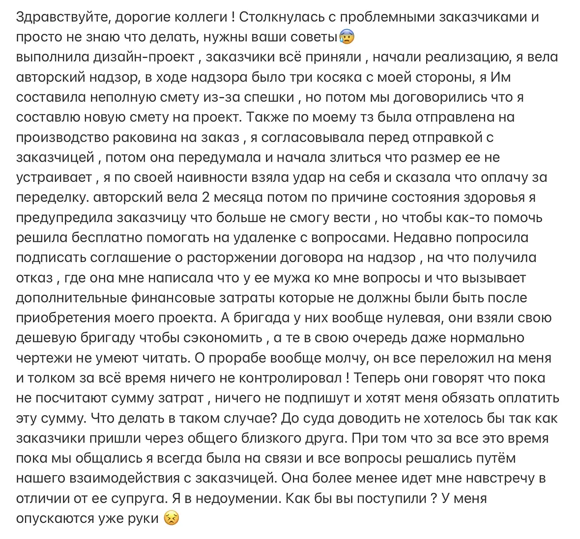 Да, вы действительно правы, я тоже поняла только потом что очень ошиблась сказав что покрою расходы на переделку. Они сели мне на шею. Мой страх просто в моих договорах, которые я составляла по шаблону и не прописывала подробно. Я просто относительно молодой ещё дизайнер, работаю только 3ий год и это мой первый авторский надзор был , поэтому опыт у меня небольшой. А они это почувствовали и катят бочку так как видят что я сама по себе тоже мягкий человек, неконфликтный и в общем я очень переживаю сейчас , ещё и Новый год на носу и как-то вообще нет уже настроения ни на что … При чем я не могу понять суть претензии, за что я им должна платить за какие-то доп расходы если мне даже бюджет не был назван конкретный …