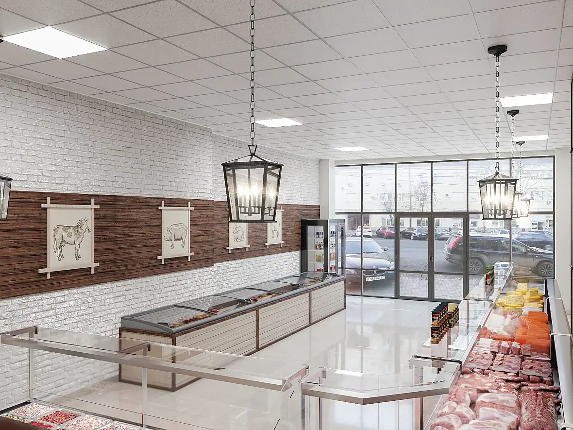 Был опыт в дизайне магазина мяса, вопрос стоял только в пожарной безопасности, проходы должны быть не менее 900мм, консультировался с пожарниками и должны быть две кассы , остальное все решал с заказчиком где что должно стоять, помещение большое 90 кв/2. Слева на право сыры хлеб, колбасы, свежее мясо , полуфабрикаты (шашлыки и всякое такое) в лари пельмени и что то еще подобное уже точно не помню, разные специи консервы и всякая такая ерунда на полки и на полки витрин, еще нужно учитывать чтобы не крали )) заказчик много внимания уделял этому) Сам дизайн по желанию заказчика. В принципе прошел все нормы без проблем.