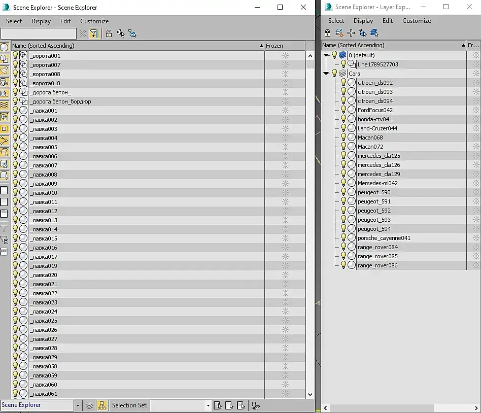В scene explorer объекты видны. Они там тупо списком. Сотни тысяч. Слоев нет. Например слой с машинами. Я не могу выделить двумя кликами по слою все машины ибо слоя нет, а выделять тупо по списку это ппц.