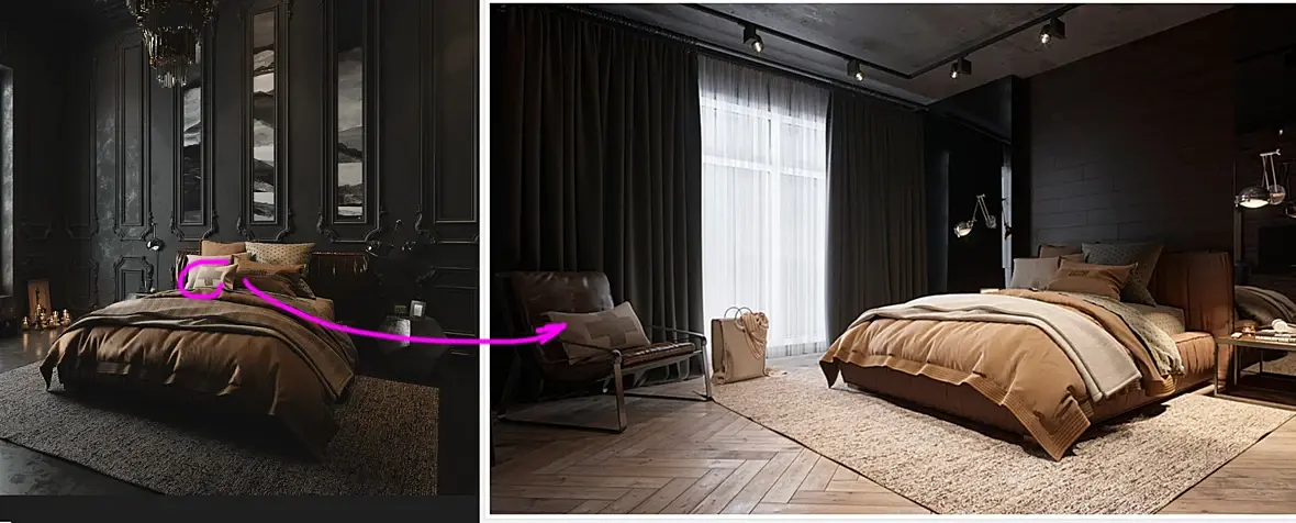 Один из мастеров сослался на реф, спасибо ему, но второй мастер выложил работу без ссылки, однако при сравнении я сделала вывод, что какие-то детали явно не случайны: например, один и тот же ковер, бежевое постельное, светильники над кроватью.