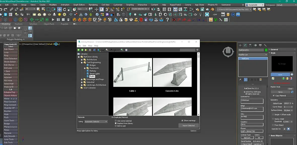3. Move the fixed file "Railclonepro.dlo" in the crack directory to C:\Program Files\Autodesk\3ds Max 2021\Plugins\ (overwrite the existing one).