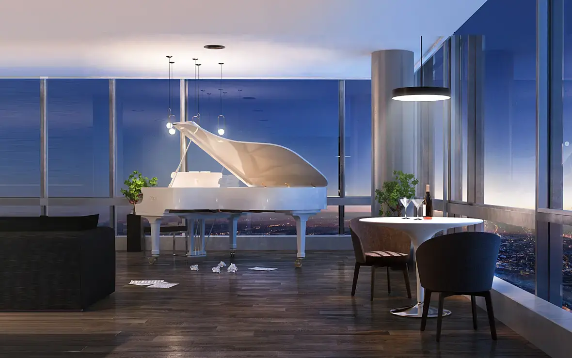 7) У вас проблемы с масштабом. Стол обычно 76-78 см, а рояль на 100 см. У вас тут рояль на 1.5 метра высотой. Сиденье стула должно 40-42 см заканчиваться, у вас на 30 примерно и т.д.