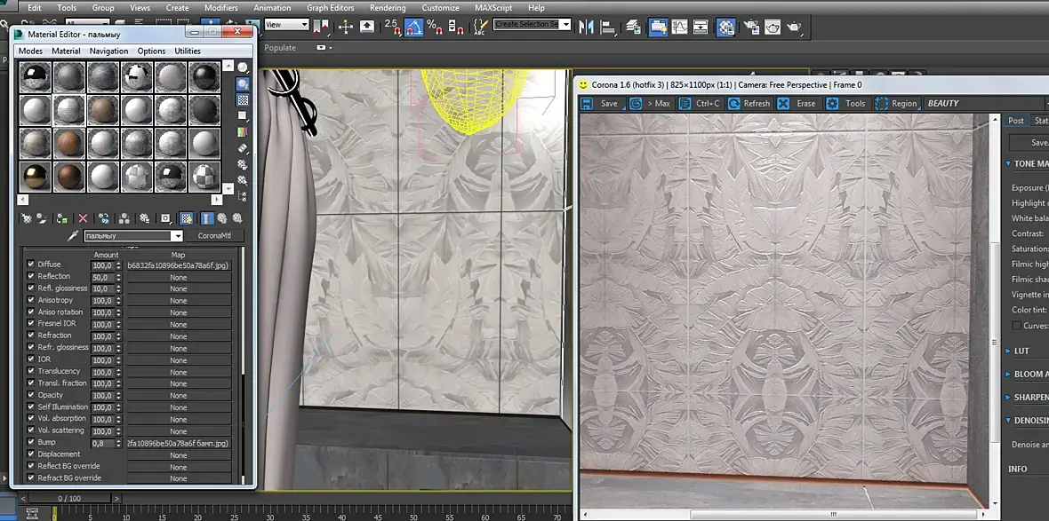 Всем доброго времени суток! Проблема такая, накладываю текстуру на плитку (листья), во вьювпорте отображается одно, на рендере совсем другое. Рендер Corona. Не понимаю в чем причина, уже и карты все удаляла оставляла только диффуз, и на бокс накладывала текстуру, и ставила галочку real word scale...А рендерит все отзеркалено не как надо(