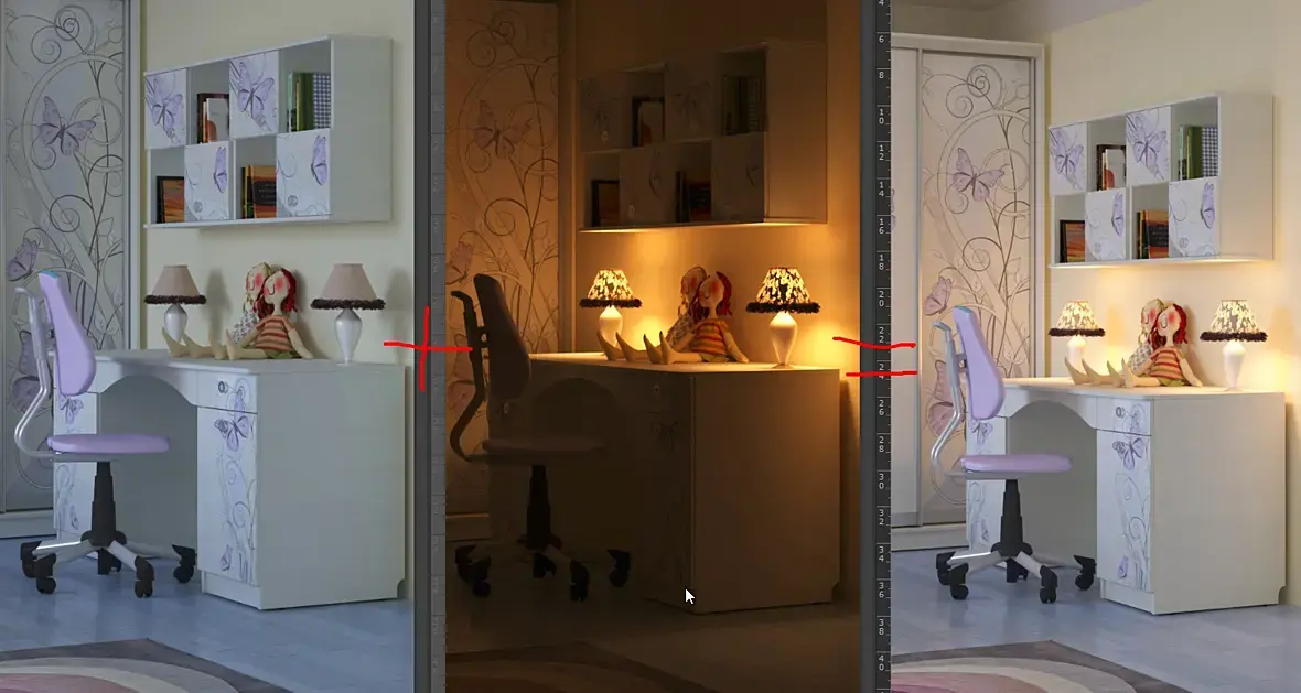 Всем добрый день! Помогите пожалуйста разобраться с задачей:1.нужно отрендерить комнату в ночном (естественном ) освещение, в которой есть выключенная лампа ( с этим все ясно ).2.нужно сделать рендер той же комнаты, с того же ракурса, только со включенной лампой ( свет упадет на кровать, одну из стен, пол, тумбочку ( лампа - ночник, маленькая, не люстра )), и каким то образом надо сохранить отдельно ее свет, чтоб потом, при наложении этого слоя на ночную картинку в фотошопе, можно было "включать\выключать" этот свет...вот тут уже бедуля, если сохранить тени альфа каналом на mate обьекте - еще с горем пополам обьятная задача, то как сохранить свет ? помогите пожалуйста!