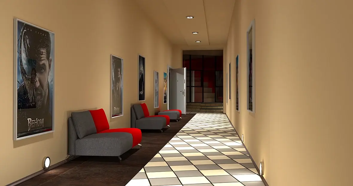 Коридор...цвет стен и расположение анонсов более смахивает на музейную галерею... никто в коридоре не будет ждать. Зона ожидания должна привлекать и развлекать или расслаблять но не напрягать.