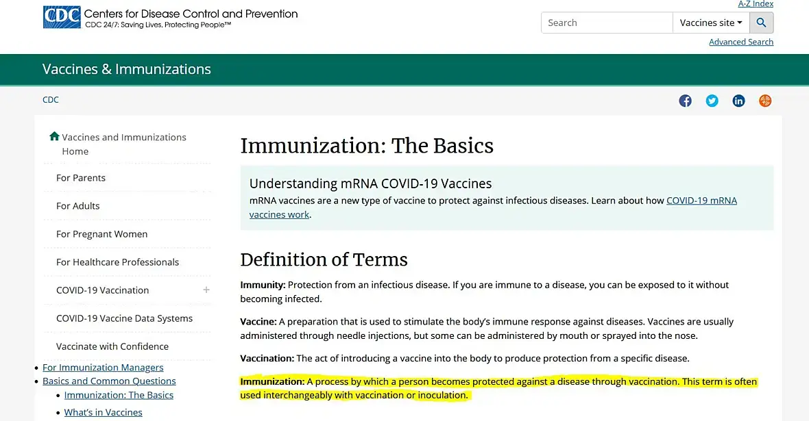 "Новое определение слова «вакцина» опубликовал Центр США по предотвращению и контролю заболеваний (CDC) 1 сентября на своей домашней странице. Новое определение слова вакцина гласит: «Вакцина — препарат, который используется для стимуляции иммунного ответа организма против болезней». Старое определение, которое можно видеть на странице CDC, записанной в web.archive 26 августа, гласит: «Вакцина — продукт, который стимулирует иммунную систему человека к выработке иммунитета к определенному заболеванию, защищая человека от этого заболевания»."