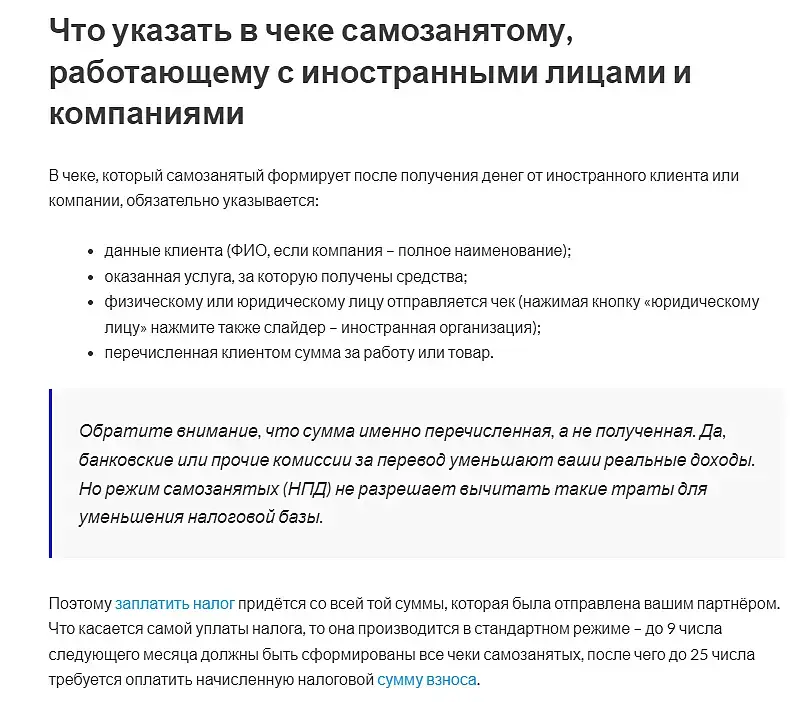 При формировании чека сумма расчетов указывается эквивалентной сумме в рублях по курсу Центрального банка Российской Федерации на дату поступления таких денежных средств на счета «самозанятого» налогоплательщика.