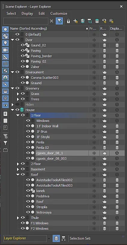 Всем привет. Нужно сделать несколько вариантов комнаты, некоторые слои должны быть и в 1 варианте и во 2. Некоторые должны отключатся. Есть ли возможность как то сделать так чтобы было удобно переключатся и не искать нужные слои отдельно. Например выбрал вариант 1, а в нем были подпункты загружены отдельно и 3d max сам уже переключал нужные слои.