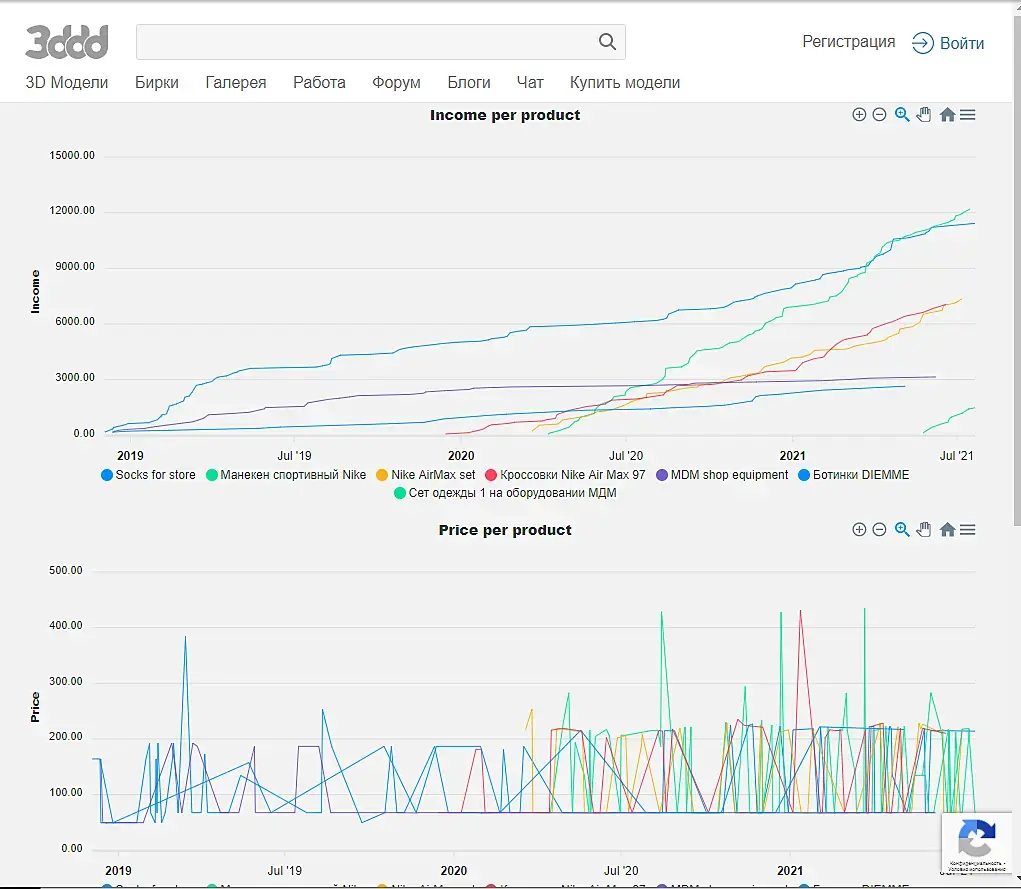 Аналогичный вывод можно сделать про модель “Кроссовки Nike Air Max 97” – несмотря на небольшие продажи в целом и низкую востребованность на 3ddd, ее очень хорошо покупали на 3dsky и по этому показателю, она близка к моим самым продаваемым Носкам, поэтому, вероятно, несмотря невысокую прибыль здесь у нее очень хорошие перспективы на западных стоках.