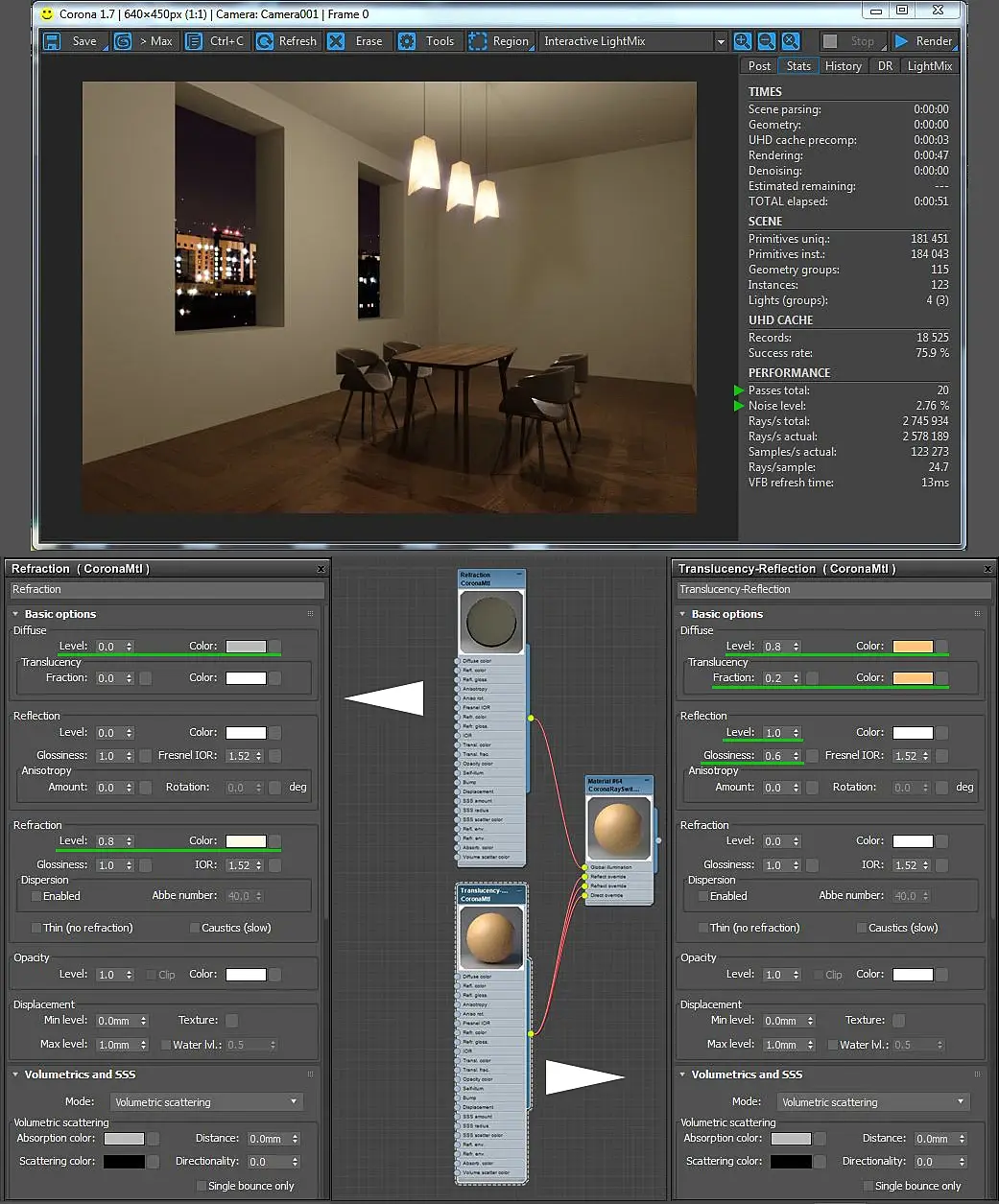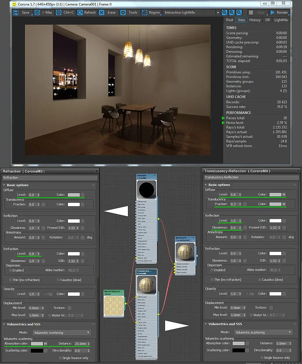 Ну, как говорится, с этого и надо было начинать. Что-то вы там накрутили страшного в настройках, зачем-то. И это стало ясно при первом же интерактив рендере. Поэтому вот что было сделано: