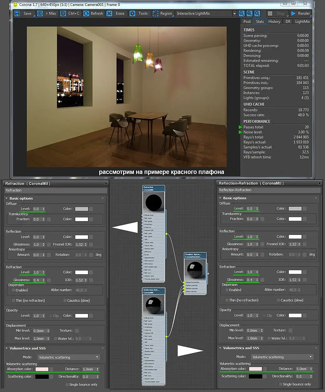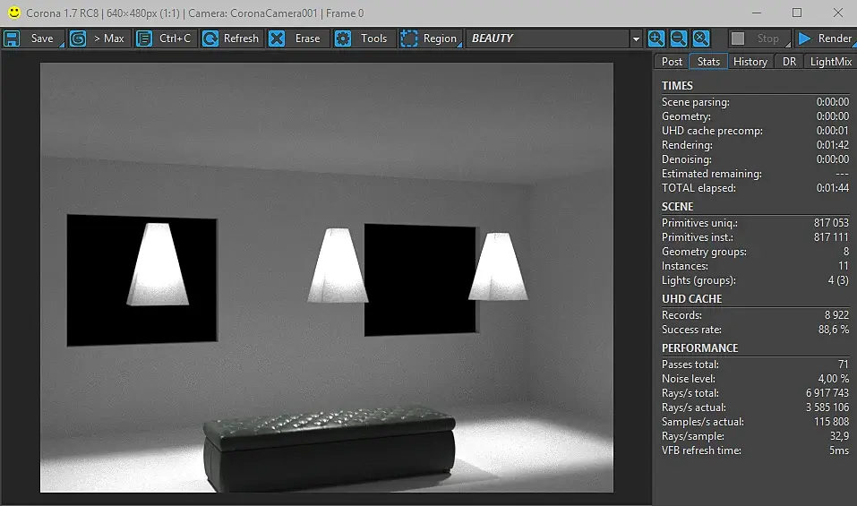 И да на выключеном освещении потребовалось немного больше времени. Но это логично: меньше света - дольше рендер. И да, я так же заменил материалы стен на стандартные короновские. До этого было просто стандартные макса.
