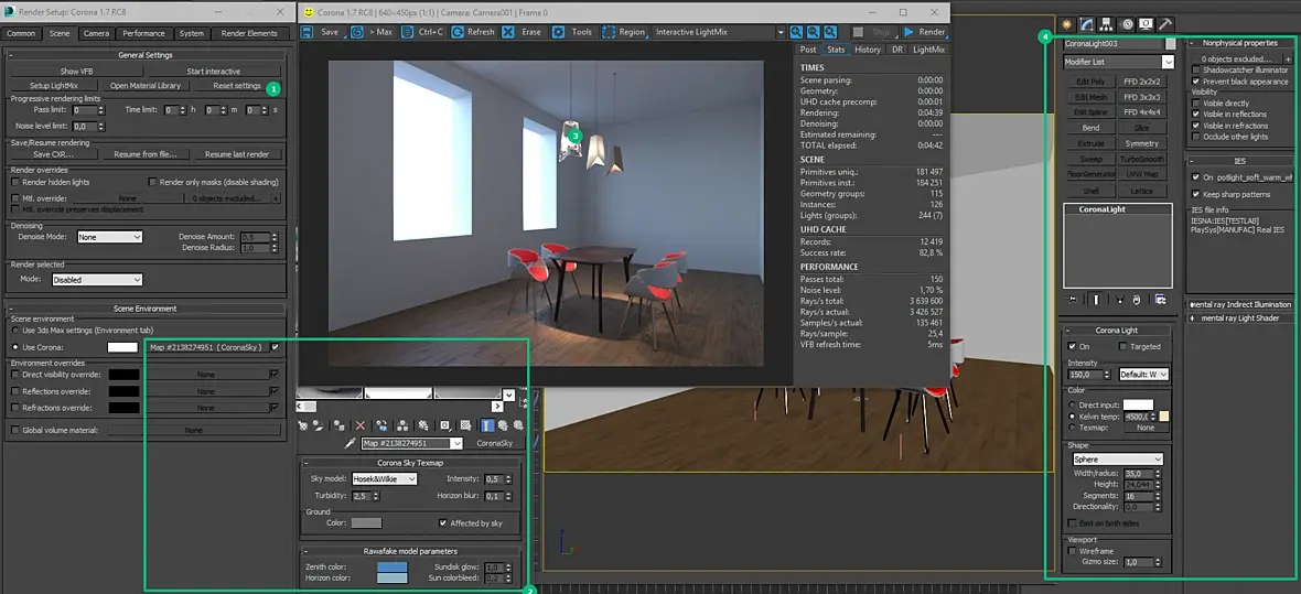 2. Настроил освещение, через стандартный корона скай, аналогично можно вставить HDR карту или темноту.