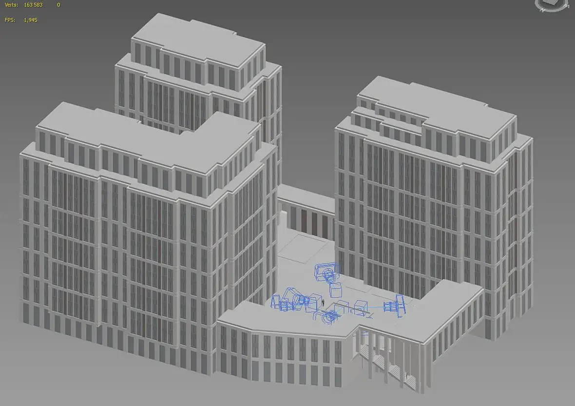 В данном комплексе, в одном из дворов будет фонтан. Весь акцент на него, нужно сделать 3-4 кадра будет. Здание готовое, но, нужно будет поставить окна, свет внутрь, тюльки. Затекстурить, возможно где-то доработать фасад. Проработать двор, и, собственно, фонтан сделать (пока даже без тз по нему).