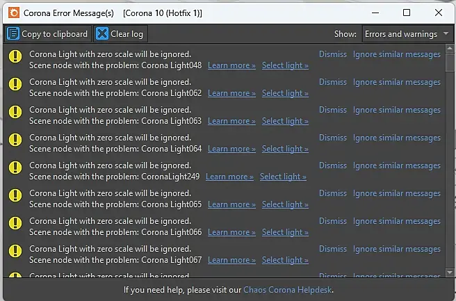 Попробуйте правой кнопкой мыши на значке масштаба кликнуть и в этой панельке слева гляньте значения (в Absolute:Local) и проставьте по 100 для каждой оси, если там нулевые значения. По идее они должны быть нулевыми, раз Корона предупреждает, что из-за этого исключает их из просчёта... p.s. Выделяя каждый объект по списку имеется ввиду, смотреть масштабы и править