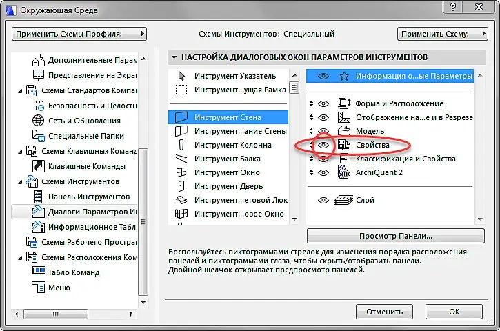 Для отображения этой вкладкинужно сделать следующее: Параметры--Окружающая среда--Диалоги Параметров Инструментов, выберите Стену или любой инструмент который нужен и откройте Свойства с права.