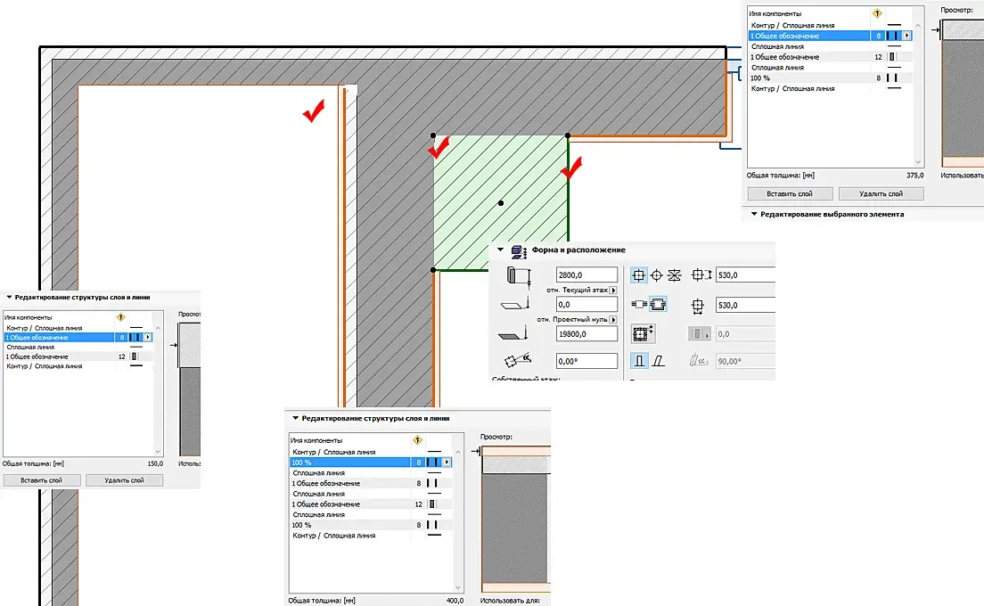 Здравствуйте, не выходит правильно совместить многослойные стены.