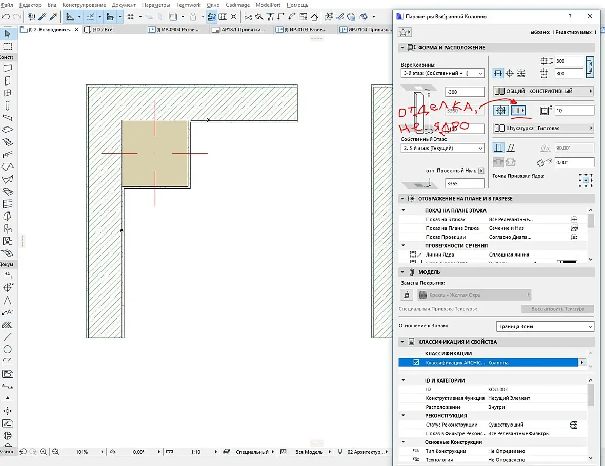 добавьте штукатурку на колонну, или сделайте стену из штукатурки, укажите что штукатурка это отделка, а не ядро