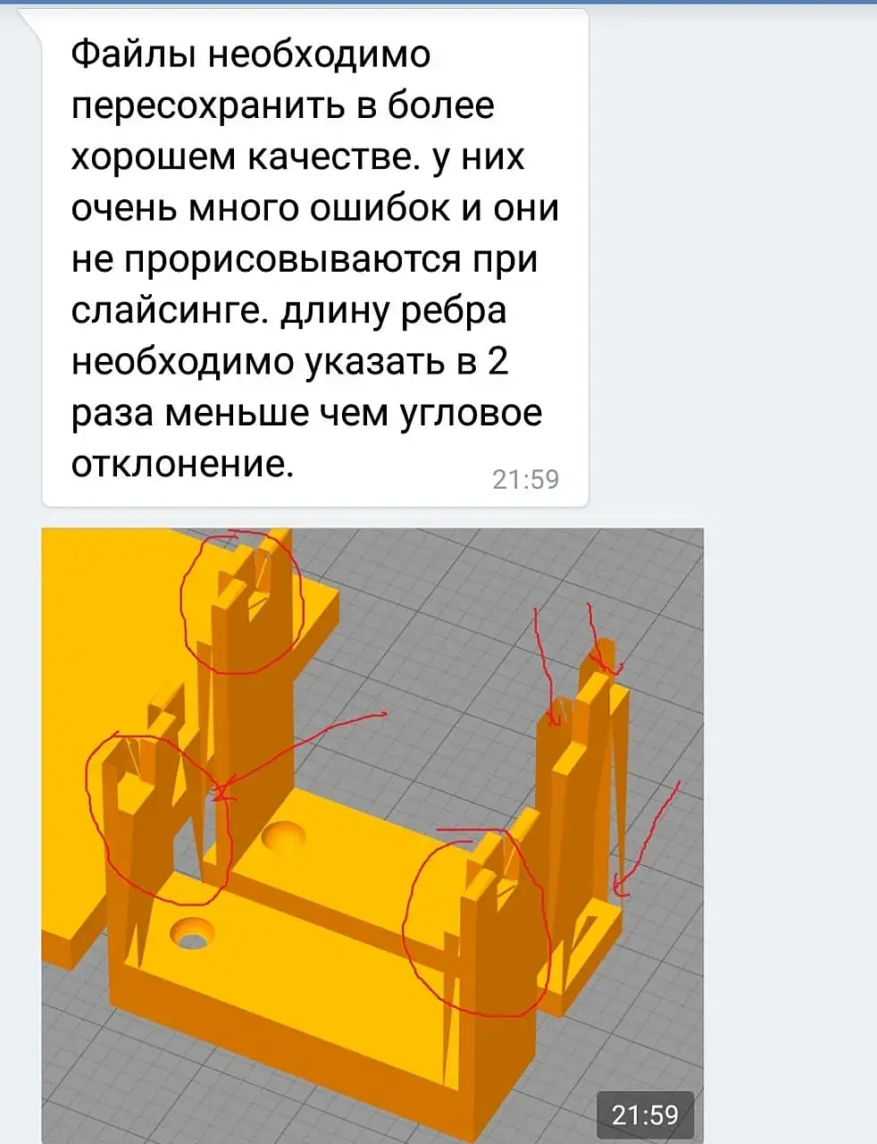 Сделала деталь, перевела в stl файл, выглядит все идеально (серая деталь), но когда отправляю на распечатку, мне вот что присылают. не понимаю в чем дело и что за ребро нужно изменить