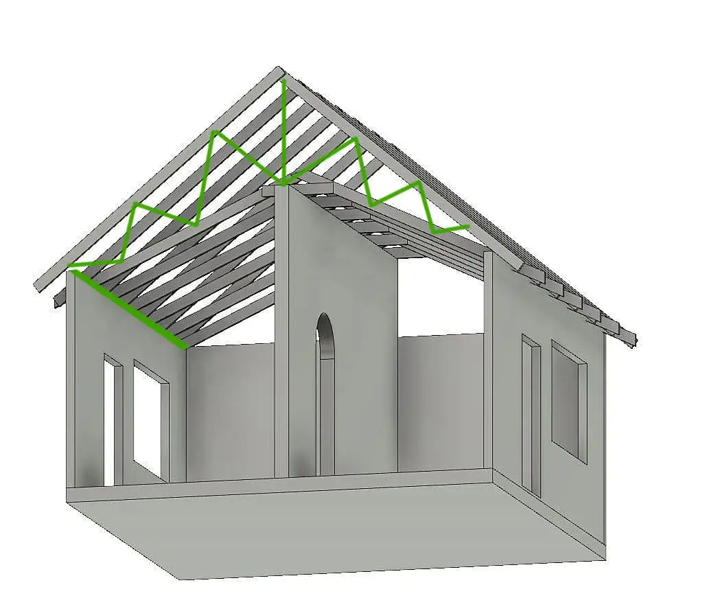 По поводу крыши, там на первом рисунке палочки не дорисованы. Простите! Вот так чуть более правильно к нашему предлагаемому варианту. И таких вертикальных балок (палочек) будет столько, сколько на самой верхней крыше преремычек (балок, трехугольничков)