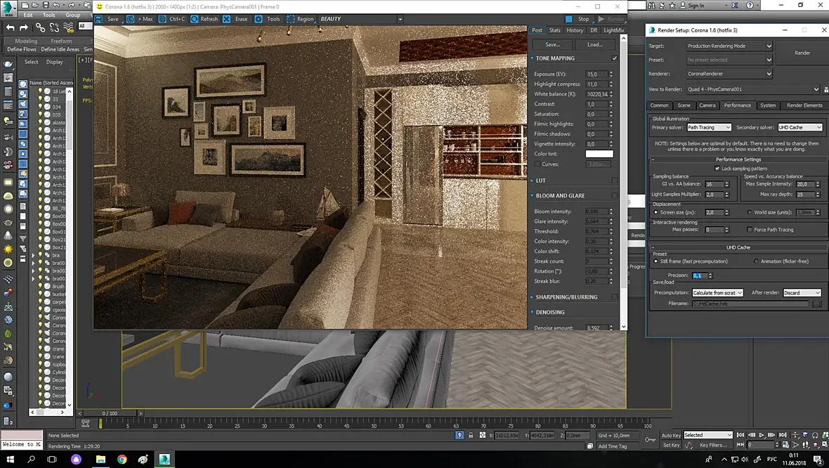 На будущее, может поможет кому-нибудь.. Ребята, если у Вас все настройки соблюдены, но при каких-то не понятных ситуациях возникают световые артефакты, советую обратить внимание на это: Заходим в Render Setup "F10" - Performance, затем в UHD Cache - Precision меняем 1 на 4. Рендер будет идти дольше, но артефакты должны испариться.