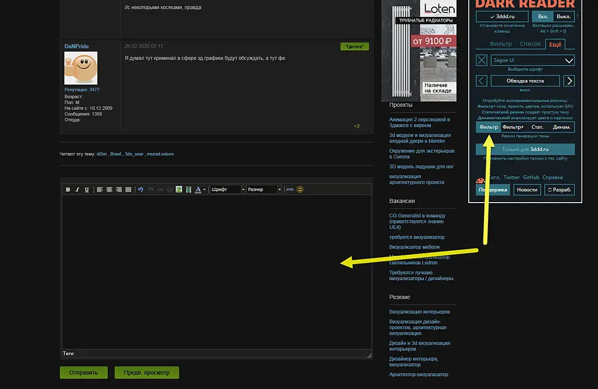 Тут пишут про темную тему для сайта 3ddd. Кто-то даже слепил тему для stylus. Вот расширение для автоматического перевода любого сайта в темную тему для хрум Dark Reader