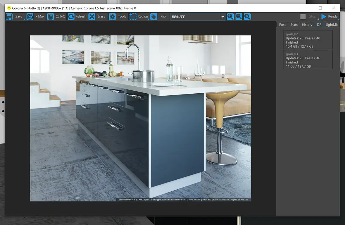 Стационарный AMD Ryzen 9 3950x  64 Gb DDR4 3200 MHz   3ds Max 2020   Corona renderer 6.2  Время рендера 13:07