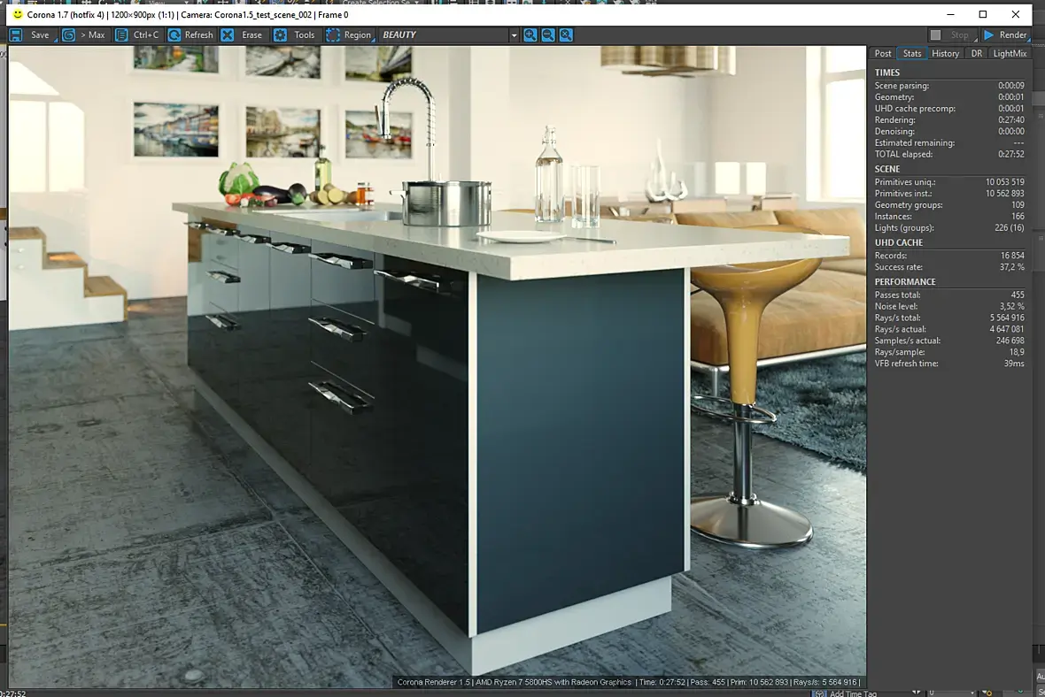 3ds Max 2018 + Corona 1.7 (hotfix 4) Ноут Asus Zephyrus G14 AMD Ryzen 7 5800hs @turbo mode RAM 16gb @ 3200 Время 0:27:52