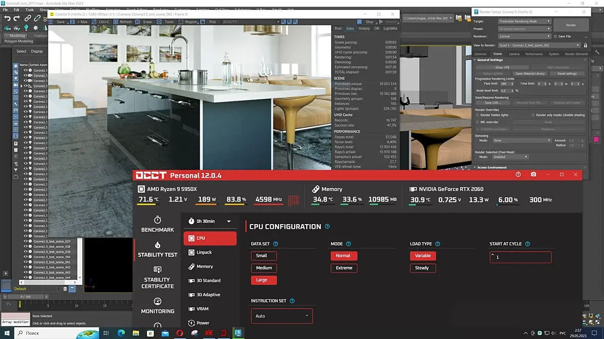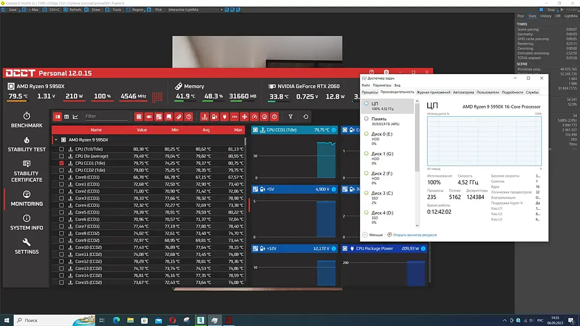 5950х( разогнан до 4.4 гц ), max 2023+corona 10