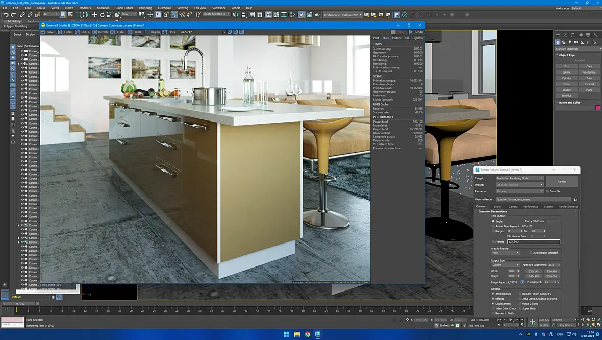 Для того чтобы точно оценить время рендера на вашем(их) процессоре(ах) - используйте подходящую версию сцены, версию Короны и версию Макса начиная с 2017го!